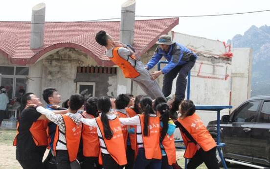 信任背摔: “你真的很不错,你真的很不错,你真的真的真的真的很不错,加油!”成员互相鼓励加油。1.6米的高台上,背摔的同学毫不迟疑地笔直倒下,稳稳地被接住,安全落地。“信任背摔”项目增进了成员之间的配合及信任。